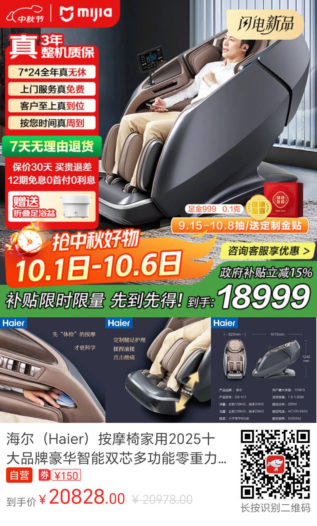 领券抢购:领取购买推荐理由:给家人最好的礼物——海尔按摩椅!京东配送,双芯智能,零重力体验,让每一天都像在做SPA。节日送礼首选,给辛勤的老师一份放松的享受吧!