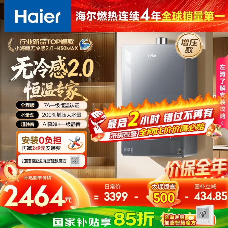 海尔(Haier)【K50MAX无冷感2.0】16升燃气热水器天然气7A一级恒温全程温暖增压大水量一级静音【国家补贴15%】