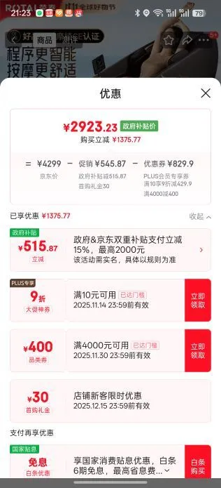 商品优惠:满4000减400元>政府补贴15%>首购礼金30>满10打9折>以旧换新补贴50