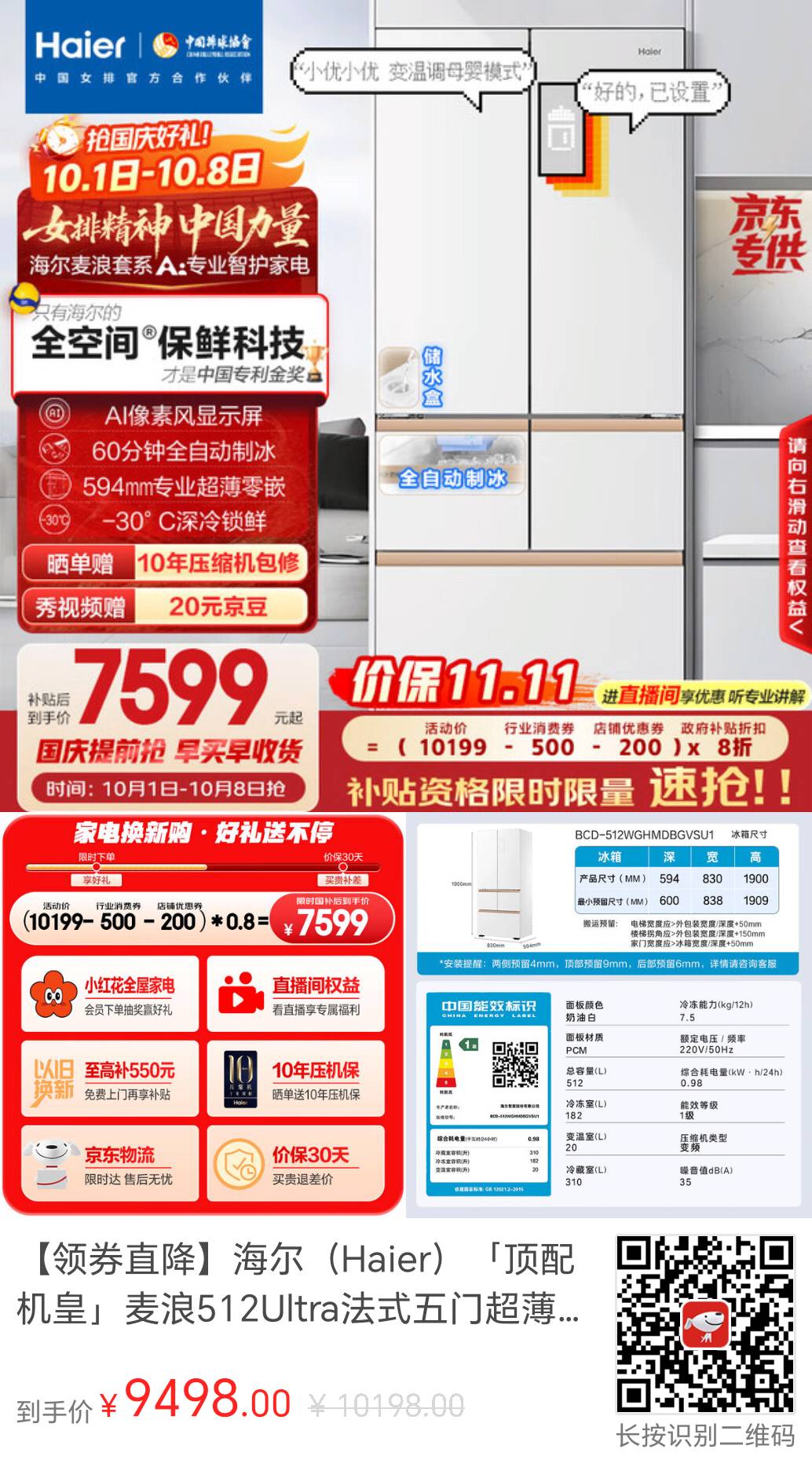 领券抢购:领券购买推荐理由:海尔「顶配机皇」麦浪512Ultra,法式五门设计,超薄零嵌,AI全自动制冰,节能环保,一级能效,京东配送,尽享便捷生活