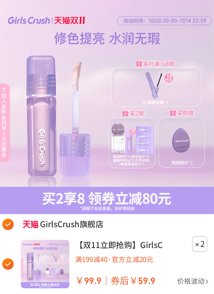 【双11立即抢购】GirlsCrush/gc水丝绒遮瑕提亮液面部遮盖黑眼圈