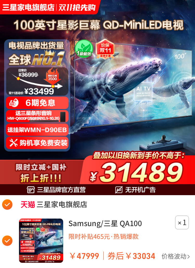 Samsung/三星 QA100QN80FJXXZ 100英寸Mini LED量子点AI电视
