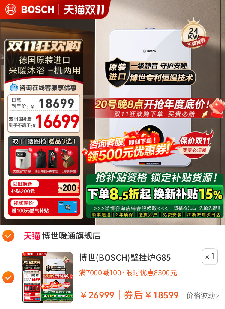 博世(BOSCH)壁挂炉G8550iW德国进口家用天然气24KW采暖两用锅炉