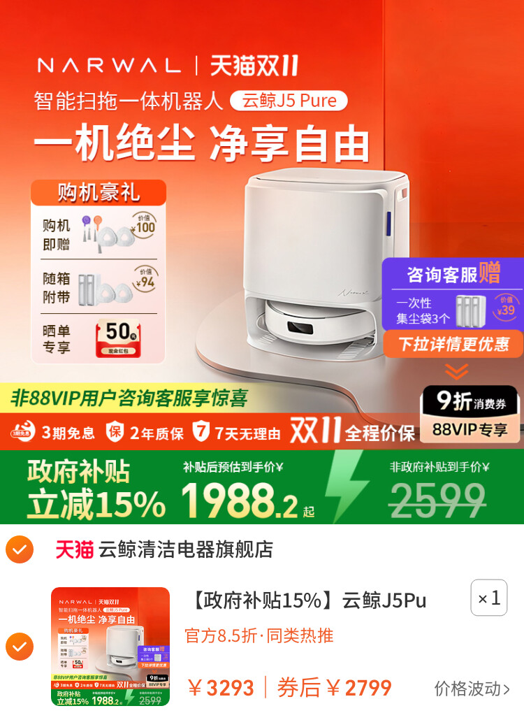 您的位置 :首页 / 优惠券 / 淘宝优惠券 【政府补贴15%】云鲸J5Pure扫地机器人扫拖吸三合一体机自动清洗 到手价:2799元 有效时间:长期有效 网购平台:淘宝 去购买 点击复制淘口令 【政府补贴15%】云鲸J5Pure扫地机器人扫拖吸三合一体机自动清洗 【推荐理由】历史热推,超千人正在疯抢 【到手价】2799.00元 【下单链接】28¥ HU293 DXESfVXIMQf¥ https://m.tb.cn/h.SO9b5c3 【政府补贴15%】云鲸J5Pure扫地机器人扫拖吸三合一体机自动清洗 优惠详情 【政府补贴15%】云鲸J5Pure扫地机器人扫拖吸三合一体机自动清洗 【推荐理由】历史热推,超千人正在疯抢 【到手价】2799.00元 【下单链接】https://s.click.taobao.com/sYdMHqp 原图片 上一张 下一张 自动/暂停播放 相关产品 聪妈花语抽纸加大加 极光0D超薄油亮丝袜性 婴儿专用手口湿纸巾 买1送1可心柔婴儿纸巾 【加量12提】大包悬挂 漫花1300张悬挂式抽纸 金日禾野牛奶加钙燕 医用妇科护垫非卫生 热门标签: 上篇:追觅s40增强扫地机器人X50pro滚筒版扫拖地一体机172 下篇:【政府补贴15%】3i扫地机器人F1Pro蒸汽滚筒活水扫拖自动洗地机 温馨提示:您可查看更多:淘宝优惠券 ,本文链接:https://www.haowubang.net//html/yhq/taobao/2375.html 京东优惠券 【京东】穗宝(SYMBOL)3D山棕床垫宝耐尔弹簧床垫健脊防螨 亲爱嘚1.8米*2米(京仓闪发) 慕思(de RUCCI)乳胶床垫500优惠券领取,铂尔曼总统套房款 奥克斯新款按摩椅最新优惠券领取,到手价2959元 ASKO雅士高极光Pro2.0进口家用洗烘套装10kg无胶圈金属门封自动投放洗衣机 慕思(de RUCCI)天然乳胶卷300元优惠券,券后申请补贴85折 小天鹅(LittleSwan)波轮洗衣机175元优惠券领取 会员充值 送月卡!夸克网盘SVIP超级会员双年卡24个月 【212元】包邮秒杀 优质素材:爱奇艺黄金vip年卡12个月/10月卡 福利价仅88.7元秒杀! 淘宝秒杀:【学生专享卡45】腾讯视频VIP会员三个月 福利价仅45元秒杀 淘金币抵扣109!爱奇艺黄金vip会员10个月 【107元】包邮秒杀 【官方直充】迅雷超级会员半年 【88元】包邮秒杀 腾讯视频超级影视会员充值vip12个月,福利价仅268元秒杀! 外卖券 饿了么红包节天天领红包活动 饿了么百元红包,开学饿请客 高校超吃卡 饿了么外卖红包,社群专享,9.9元吃饱喝足 饿了么霸王餐红包,评价有礼单单返 淘宝闪购,爆品好价外卖红包