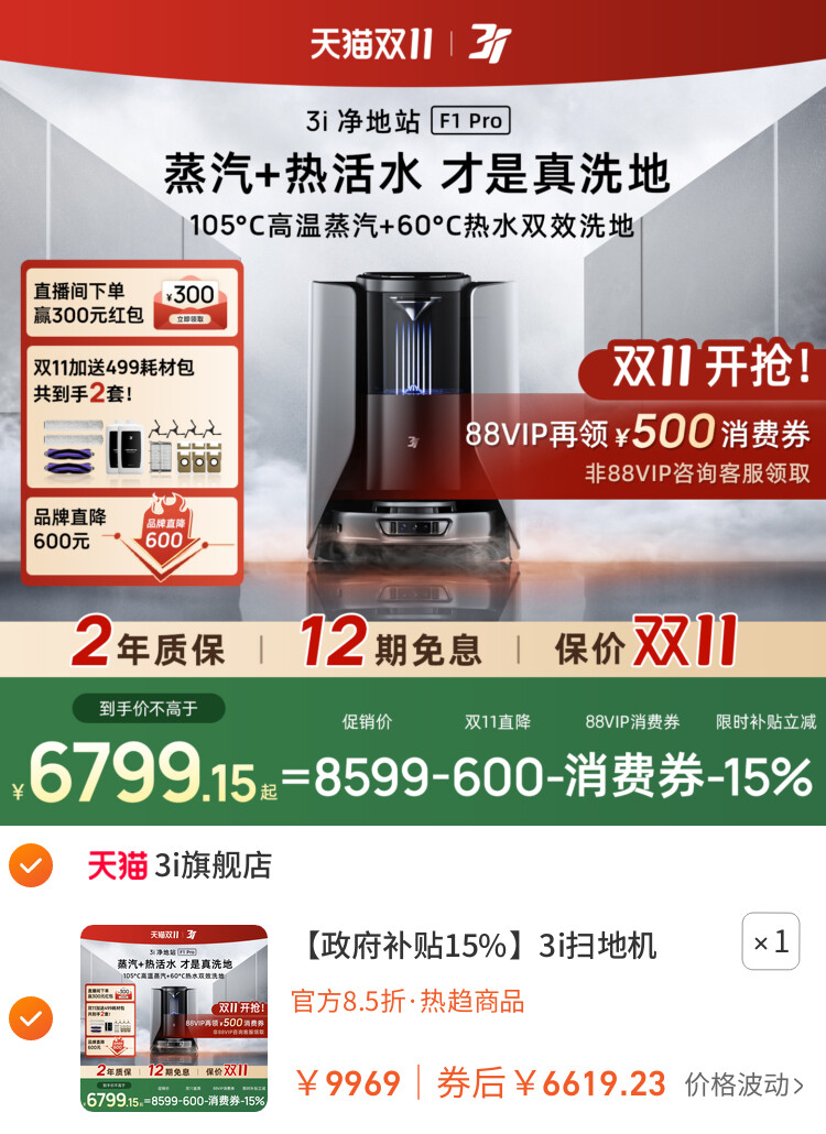 【政府补贴15%】3i扫地机器人F1Pro蒸汽滚筒活水扫拖自动洗地机