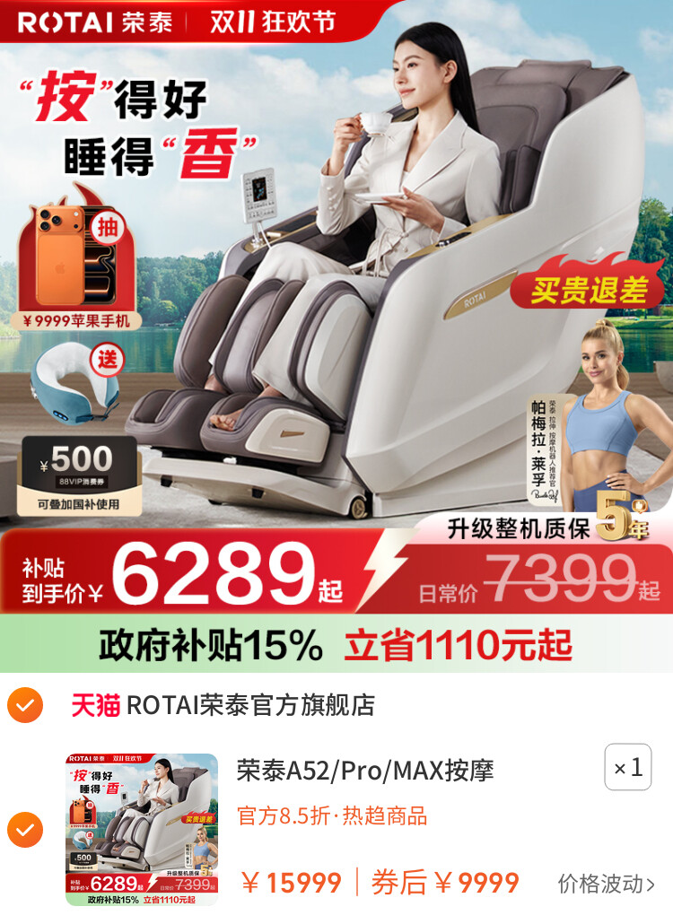 您的位置 :首页 / 优惠券 / 淘宝优惠券 荣泰A52/Pro/MAX按摩椅家用全身豪华太空舱全自动多功能按摩沙发 到手价:9999元 有效时间:长期有效 网购平台:淘宝 去购买 点击复制淘口令 荣泰A52/Pro/MAX按摩椅家用全身豪华太空舱全自动多功能按摩沙发 【推荐理由】同类热推 【券面额】3600元 【到手价】9999.00元 【下单链接】78¥ CZ321 2YAkfg978eo¥ https://m.tb.cn/h.So2QiRG 荣泰A52/Pro/MAX按摩椅家用全身豪华太空舱全自动多功能按摩沙发 优惠详情 荣泰A52/Pro/MAX按摩椅家用全身豪华太空舱全自动多功能按摩沙发 【推荐理由】同类热推 【券面额】3600元 【到手价】9999.00元 【下单链接】https://s.click.taobao.com/JES4qvp 原图片 上一张 下一张 自动/暂停播放 相关产品 【政府补贴15%】A39按 OSIM傲胜V3按摩椅家用 荣泰S56Pro按摩椅全身 【政府补贴15%】奥佳 荣泰A52/Pro/MAX按摩椅家 奥佳华7508Pro+按摩椅家 【政府补贴15%】奥佳 【政府补贴15%】荣泰 热门标签: 按摩椅荣泰按摩椅优惠券国补 上篇:奥佳华7508Pro+按摩椅家用全身小型太空舱电动智能按摩沙发椅新款 下篇:【政府补贴15%】奥佳华7808S按摩椅家用全身太空舱全自动按摩沙发 温馨提示:您可查看更多:淘宝优惠券 ,本文链接:https://www.haowubang.net//html/yhq/taobao/4081.html 京东优惠券 【京东】穗宝(SYMBOL)3D山棕床垫宝耐尔弹簧床垫健脊防螨 亲爱嘚1.8米*2米(京仓闪发) ASKO雅士高欧洲进口洗烘套装优惠券领取 京东顾家家居按摩椅7折优惠,到手价才2543元 长虹空调优惠券领取,大1匹新一级省电 海尔冰箱优惠券700元领取,国家以旧换新最高补贴20%, 【京东】喜临门泰国柔感乳胶双层弹簧床垫300优惠券 会员充值 送月卡!夸克网盘SVIP超级会员双年卡24个月 【212元】包邮秒杀 送双周卡!夸克网盘SVIP超级会员12个月 【112元】包邮秒杀 【69元1年】优酷会员vip12个月年卡 券后【69元】包邮秒杀 爱奇艺vip会员白金12个月年卡 【183.93元】包邮秒杀 腾讯视频超级影视会员充值vip12个月,福利价仅268元秒杀! 送月卡!夸克网盘SVIP超级会员双年卡24个月 【212元】包邮秒杀 外卖券 饿了么外卖红包,社群专享,9.9元吃饱喝足 闪购新用户可领首单免单福利 淘宝闪购,爆品好价外卖红包 饿了么18.8极限爆涨红包 饿了么百元红包,开学饿请客 高校超吃卡