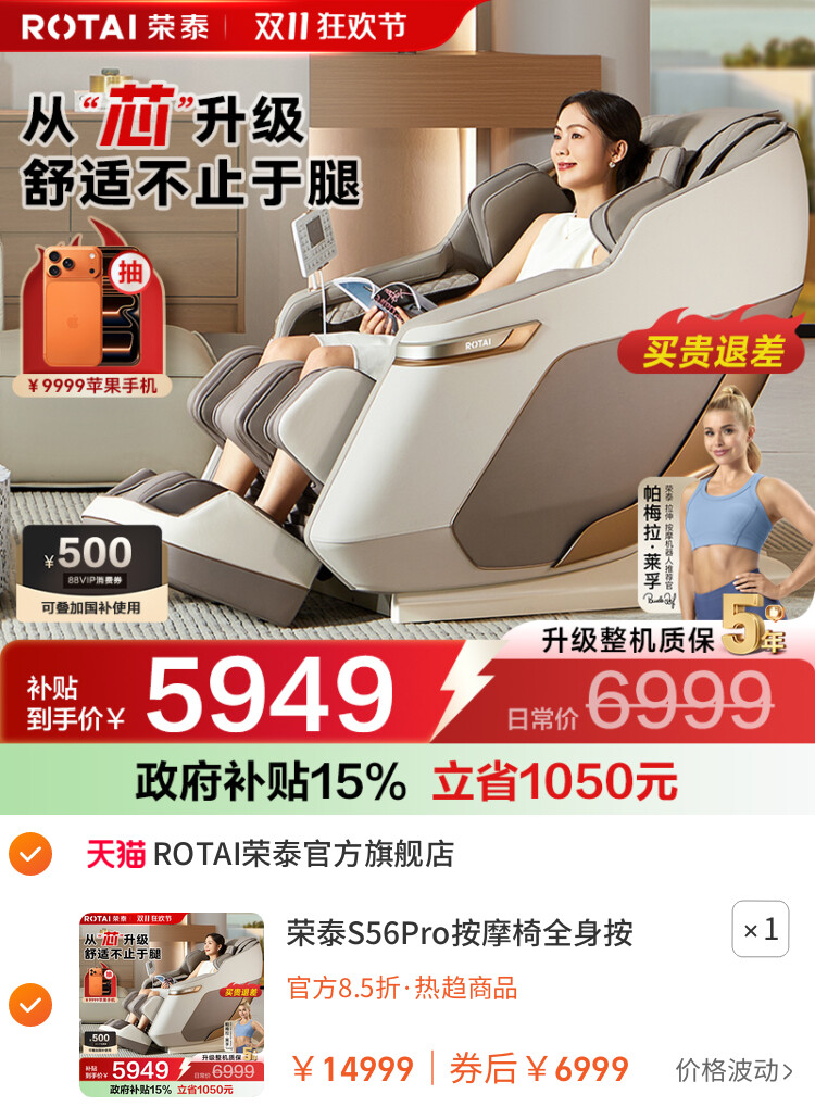 您的位置 :首页 / 优惠券 / 淘宝优惠券 荣泰S56Pro按摩椅全身按摩多功能太空舱家用椅子【政府补贴15%】 到手价:6999元 有效时间:长期有效 网购平台:淘宝 去购买 点击复制淘口令 荣泰S56Pro按摩椅全身按摩多功能太空舱家用椅子【政府补贴15%】 【推荐理由】近期热门,同类热推 【券面额】5750元 【到手价】6999.00元 【下单链接】99¥ HU108 kreLfg99ekf¥ https://m.tb.cn/h.Sowrc4Q 荣泰S56Pro按摩椅全身按摩多功能太空舱家用椅子【政府补贴15%】 优惠详情 荣泰S56Pro按摩椅全身按摩多功能太空舱家用椅子【政府补贴15%】 【推荐理由】近期热门,同类热推 【券面额】5750元 【到手价】6999.00元 【下单链接】https://s.click.taobao.com/wJsrpvp 原图片 上一张 下一张 自动/暂停播放 相关产品 【政府补贴15%】A39按 OSIM傲胜V3按摩椅家用 荣泰S56Pro按摩椅全身 【政府补贴15%】奥佳 荣泰A52/Pro/MAX按摩椅家 奥佳华7508Pro+按摩椅家 【政府补贴15%】奥佳 【政府补贴15%】荣泰 热门标签: 荣泰按摩椅优惠券国补按摩椅国补领取 上篇:【政府补贴15%】奥佳华7808S按摩椅家用全身太空舱全自动按摩沙发 下篇:OSIM傲胜V3按摩椅家用全身全自动多功能智能AI舒压椅太空舱8242 温馨提示:您可查看更多:淘宝优惠券 ,本文链接:https://www.haowubang.net//html/yhq/taobao/4083.html 京东优惠券 【京东】穗宝(SYMBOL)3D山棕床垫宝耐尔弹簧床垫健脊防螨 亲爱嘚1.8米*2米(京仓闪发) 长虹空调优惠券领取,大1匹新一级省电 海尔冰箱优惠券700元领取,国家以旧换新最高补贴20%, 【京东】喜临门泰国柔感乳胶双层弹簧床垫300优惠券 ASKO雅士高欧洲进口洗烘套装优惠券领取 京东顾家家居按摩椅7折优惠,到手价才2543元 会员充值 送月卡!夸克网盘SVIP超级会员双年卡24个月 【212元】包邮秒杀 腾讯视频超级影视会员充值vip12个月,福利价仅268元秒杀! 【69元1年】优酷会员vip12个月年卡 券后【69元】包邮秒杀 爱奇艺vip会员白金12个月年卡 【183.93元】包邮秒杀 送双周卡!夸克网盘SVIP超级会员12个月 【112元】包邮秒杀 送月卡!夸克网盘SVIP超级会员双年卡24个月 【212元】包邮秒杀 外卖券 饿了么百元红包,开学饿请客 高校超吃卡 淘宝闪购,爆品好价外卖红包 饿了么18.8极限爆涨红包 饿了么外卖红包,社群专享,9.9元吃饱喝足 闪购新用户可领首单免单福利