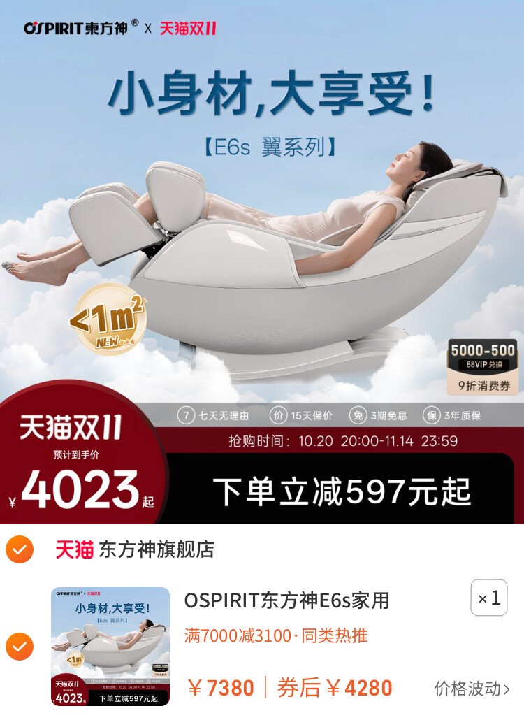 OSPIRIT东方神E6s家用小型专业按摩椅多功能全自动智能设计高颜值