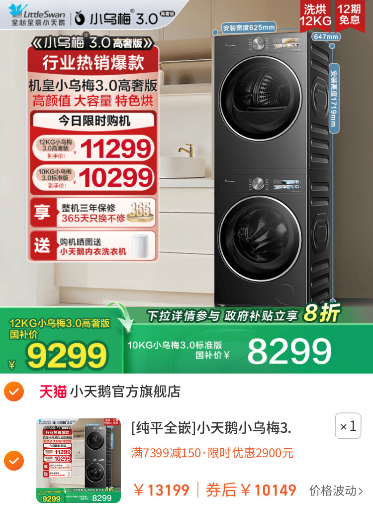 [纯平全嵌]小天鹅小乌梅3.0洗烘套装12/10KG洗衣机变频热泵烘干机