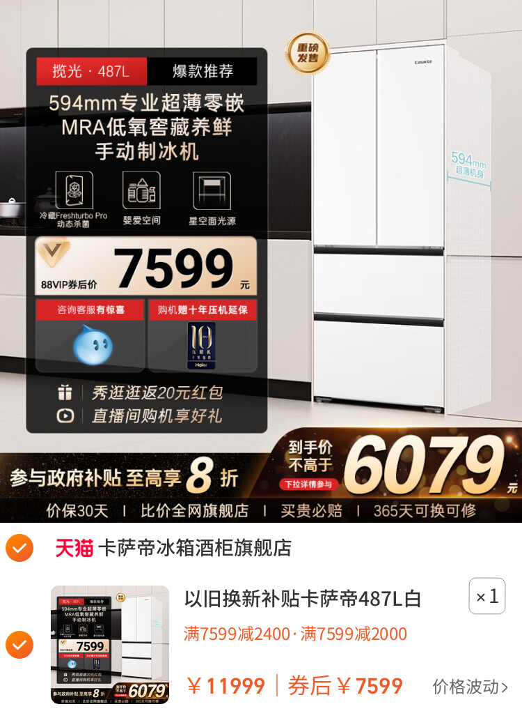您的位置 :首页 / 优惠券 / 淘宝优惠券 卡萨帝487L制冰电冰箱[2000元]优惠券,以旧换新补贴 到手价:7599元 有效时间:长期有效 网购平台:淘宝 去购买 点击复制淘口令 以旧换新补贴卡萨帝487L白色超薄零嵌入式法式多门家用制冰电冰箱 【推荐理由】历史热推,超千人种草 【券面额】2000元 【到手价】7599.00元 【下单链接】59¥ CZ321 XNnqf9a9dFK¥ https://m.tb.cn/h.St2UiIG 以旧换新补贴卡萨帝487L白色超薄零嵌入式法式多门家用制冰电冰箱 优惠详情 以旧换新补贴卡萨帝487L白色超薄零嵌入式法式多门家用制冰电冰箱 【推荐理由】历史热推,超千人种草 【券面额】2000元 【到手价】7599.00元 【下单链接】https://s.click.taobao.com/6nv4Ffp 原图片 上一张 下一张 自动/暂停播放 相关产品 卡萨帝揽光制冰电冰 【政府补贴20%】新品 TCL冷布丁嵌全自动制 海尔小红花制冰电冰 美的家用小型冰箱淘 海尔麦浪嵌入式冰箱 卡萨帝揽光家用电冰 海尔冰箱以旧换新补 热门标签: 卡萨帝冰箱,冰箱优惠券 上篇:海尔217L风冷无霜变频小冰箱官方旗舰1599元优惠券 下篇:海尔冰箱以旧换新补贴512L麦浪【100元】淘宝优惠券 温馨提示:您可查看更多:淘宝优惠券 ,本文链接:https://www.haowubang.net//html/yhq/taobao/6197.html 京东优惠券 语森忆意大利ROKERT火箭R58咖啡机 【京东】格力(GREE)3匹 天仪 一级能效 变频冷暖 净菌自洁 出风口可拆洗 立柜式空调柜机 KFR-72LW/(72504)FNhAa-B1 京东】慕思(de RUCCI)天然乳胶垫慕斯独立筒弹簧防螨床垫 梦觉 1.8*2.0米 慕思(de RUCCI)乳胶床垫500优惠券领取,铂尔曼总统套房款 慕思乳进口胶床垫300元优惠券领取,还可以享受国家补贴85折 京东奥克斯(AUX)按摩椅2025新款150元优惠券,到手机2230元 会员充值 送月卡!夸克网盘SVIP超级会员双年卡24个月 【212元】包邮秒杀 优质素材:芒果/优酷年卡会员仅需57 福利价仅57元秒杀! 淘金币抵扣109!爱奇艺黄金vip会员10个月 【107元】包邮秒杀 【69元1年】优酷会员vip12个月年卡 券后【69元】包邮秒杀 送月卡!夸克网盘SVIP超级会员双年卡24个月 【212元】包邮秒杀 淘宝秒杀:【学生专享卡45】腾讯视频VIP会员三个月 福利价仅45元秒杀 外卖券 饿了么外卖红包,社群专享,9.9元吃饱喝足 饿了么18.8极限爆涨红包 淘宝闪购,爆品好价外卖红包 闪购新用户可领首单免单福利 淘宝闪购红包,领最高15元大额红包
