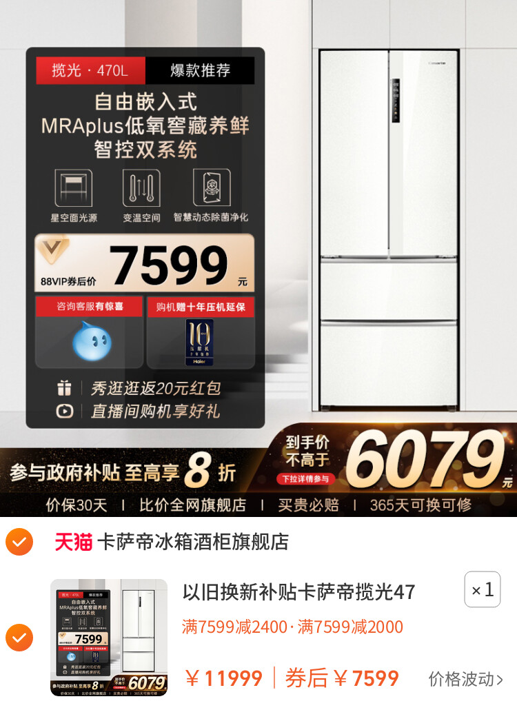 您的位置 :首页 / 优惠券 / 淘宝优惠券 卡萨帝揽光家用电冰箱,以旧换新补贴2000元优惠券 到手价:7599元 有效时间:长期有效 网购平台:淘宝 去购买 点击复制淘口令 以旧换新补贴卡萨帝揽光470L白色嵌入式法式多门双系统家用电冰箱 【推荐理由】品牌高佣,超千人种草 【券面额】2000元 【到手价】7599.00元 【下单链接】28¥ MF287 0dcGf9avnoE¥ https://m.tb.cn/h.SGmt4J3 以旧换新补贴卡萨帝揽光470L白色嵌入式法式多门双系统家用电冰箱 优惠详情 以旧换新补贴卡萨帝揽光470L白色嵌入式法式多门双系统家用电冰箱 【推荐理由】品牌高佣,超千人种草 【券面额】2000元 【到手价】7599.00元 【下单链接】https://s.click.taobao.com/5p5IxSp 原图片 上一张 下一张 自动/暂停播放 相关产品 卡萨帝揽光制冰电冰 【政府补贴20%】新品 TCL冷布丁嵌全自动制 海尔小红花制冰电冰 美的家用小型冰箱淘 海尔麦浪嵌入式冰箱 卡萨帝揽光家用电冰 海尔冰箱以旧换新补 热门标签: 卡萨帝冰箱,冰箱优惠券 上篇:海尔双系统小红花制冰冰箱【2026新款】淘宝优惠券 下篇:海尔冰箱以旧换新补贴,淘宝100元优惠券 温馨提示:您可查看更多:淘宝优惠券 ,本文链接:https://www.haowubang.net//html/yhq/taobao/6202.html 京东优惠券 语森忆意大利ROKERT火箭R58咖啡机 京东】慕思(de RUCCI)天然乳胶垫慕斯独立筒弹簧防螨床垫 梦觉 1.8*2.0米 慕思(de RUCCI)乳胶床垫500优惠券领取,铂尔曼总统套房款 慕思乳进口胶床垫300元优惠券领取,还可以享受国家补贴85折 【京东】格力(GREE)3匹 天仪 一级能效 变频冷暖 净菌自洁 出风口可拆洗 立柜式空调柜机 KFR-72LW/(72504)FNhAa-B1 京东奥克斯(AUX)按摩椅2025新款150元优惠券,到手机2230元 会员充值 送月卡!夸克网盘SVIP超级会员双年卡24个月 【212元】包邮秒杀 送月卡!夸克网盘SVIP超级会员双年卡24个月 【212元】包邮秒杀 淘金币抵扣109!爱奇艺黄金vip会员10个月 【107元】包邮秒杀 淘宝秒杀:【学生专享卡45】腾讯视频VIP会员三个月 福利价仅45元秒杀 【69元1年】优酷会员vip12个月年卡 券后【69元】包邮秒杀 优质素材:芒果/优酷年卡会员仅需57 福利价仅57元秒杀! 外卖券 淘宝闪购,爆品好价外卖红包 闪购新用户可领首单免单福利 饿了么外卖红包,社群专享,9.9元吃饱喝足 饿了么18.8极限爆涨红包 淘宝闪购红包,领最高15元大额红包