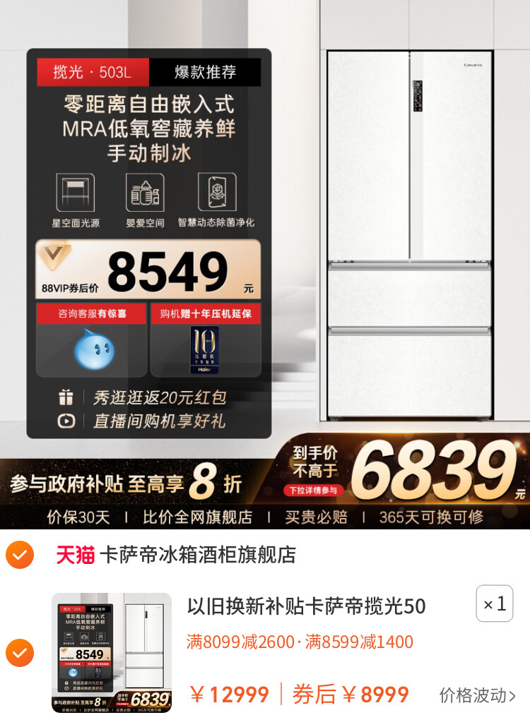 您的位置 :首页 / 优惠券 / 淘宝优惠券 卡萨帝揽光制冰电冰箱,1400元优惠券,以旧换新补贴 到手价:8999元 有效时间:长期有效 网购平台:淘宝 去购买 点击复制淘口令 以旧换新补贴卡萨帝揽光503L白色超薄零嵌入式法式家用制冰电冰箱 【推荐理由】近期热门,同类热推 【券面额】1400元 【到手价】8999.00元 【下单链接】97¥ MF168 k4zof909nma¥ https://m.tb.cn/h.StW5HFh 以旧换新补贴卡萨帝揽光503L白色超薄零嵌入式法式家用制冰电冰箱 优惠详情 以旧换新补贴卡萨帝揽光503L白色超薄零嵌入式法式家用制冰电冰箱 【推荐理由】近期热门,同类热推 【券面额】1400元 【到手价】8999.00元 【下单链接】https://s.click.taobao.com/RbsHtSp 原图片 上一张 下一张 自动/暂停播放 相关产品 卡萨帝揽光制冰电冰 【政府补贴20%】新品 TCL冷布丁嵌全自动制 海尔小红花制冰电冰 美的家用小型冰箱淘 海尔麦浪嵌入式冰箱 卡萨帝揽光家用电冰 海尔冰箱以旧换新补 热门标签: 卡萨帝以旧换新补贴电冰箱 上篇:【政府补贴20%】新品海尔电冰箱,淘宝3010元优惠券 下篇:暂无 温馨提示:您可查看更多:淘宝优惠券 ,本文链接:https://www.haowubang.net//html/yhq/taobao/6210.html 京东优惠券 语森忆意大利ROKERT火箭R58咖啡机 京东奥克斯(AUX)按摩椅2025新款150元优惠券,到手机2230元 慕思(de RUCCI)乳胶床垫500优惠券领取,铂尔曼总统套房款 【京东】格力(GREE)3匹 天仪 一级能效 变频冷暖 净菌自洁 出风口可拆洗 立柜式空调柜机 KFR-72LW/(72504)FNhAa-B1 慕思乳进口胶床垫300元优惠券领取,还可以享受国家补贴85折 京东】慕思(de RUCCI)天然乳胶垫慕斯独立筒弹簧防螨床垫 梦觉 1.8*2.0米 会员充值 送月卡!夸克网盘SVIP超级会员双年卡24个月 【212元】包邮秒杀 淘金币抵扣109!爱奇艺黄金vip会员10个月 【107元】包邮秒杀 淘宝秒杀:【学生专享卡45】腾讯视频VIP会员三个月 福利价仅45元秒杀 【69元1年】优酷会员vip12个月年卡 券后【69元】包邮秒杀 送月卡!夸克网盘SVIP超级会员双年卡24个月 【212元】包邮秒杀 优质素材:芒果/优酷年卡会员仅需57 福利价仅57元秒杀! 外卖券 闪购新用户可领首单免单福利 淘宝闪购红包,领最高15元大额红包 饿了么外卖红包,社群专享,9.9元吃饱喝足 淘宝闪购,爆品好价外卖红包 饿了么18.8极限爆涨红包