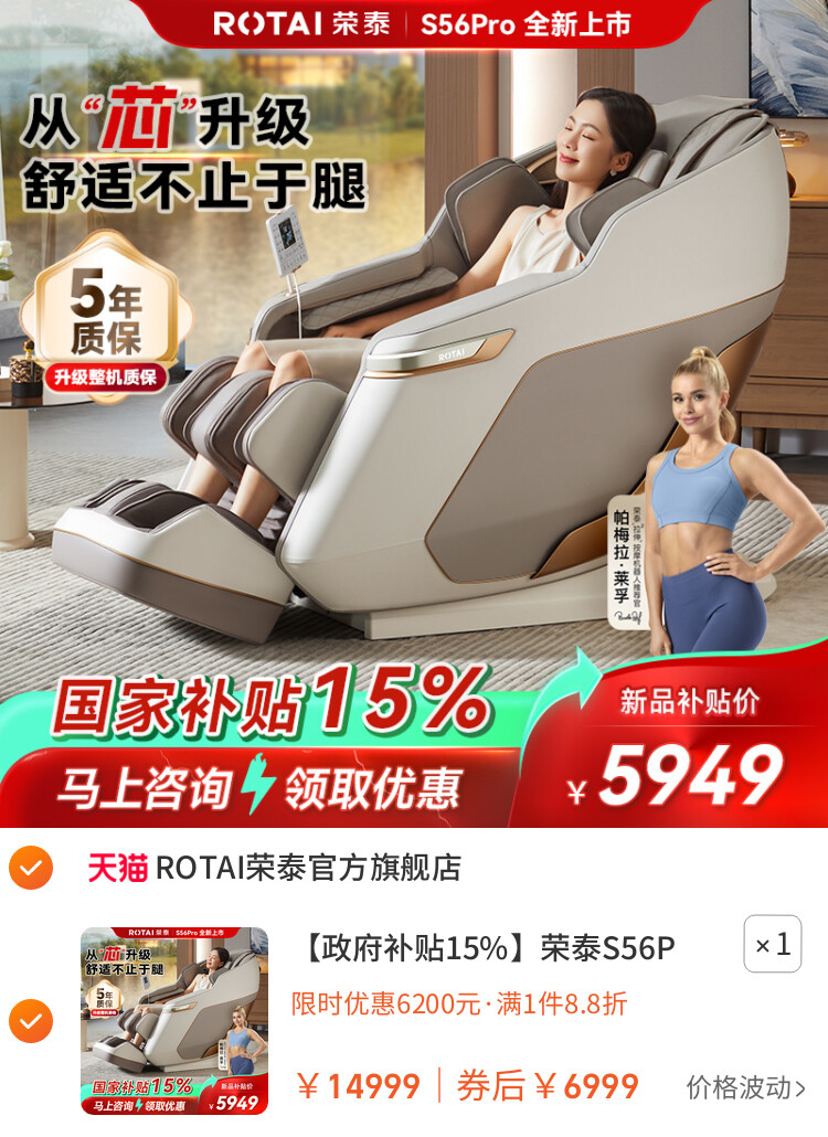 您的位置 :首页 / 优惠券 / 淘宝优惠券 【政府补贴15%】荣泰S56Pro按摩椅全身按摩多功能太空舱家用沙发 到手价:6999元 有效时间:长期有效 网购平台:淘宝 去购买 点击复制淘口令 67¥ CZ321 82C84zoz3qE¥ https://m.tb.cn/h.SgEfSJf 【政府补贴15%】荣泰S56Pro按摩椅全身按摩多功能太空舱家用沙发 优惠详情 【政府补贴15%】荣泰S56Pro按摩椅全身按摩多功能太空舱家用沙发 【推荐理由】热门商品 【到手价】6999.00元 【下单链接】点击下单 原图片 上一张 下一张 自动/暂停播放 相关产品 亿健跑步机家用款大 麦瑞克跑步机家用折 立久佳E9跑步机家用款 舒华马拉松跑步机家 SHUA舒华家用马拉松跑 立久佳X9跑步机家用款 麦瑞克跑步机小型家 麦瑞克幻影X5大坡度护 热门标签: 按摩椅荣泰按摩椅优惠券国补 上篇:奥克斯新款音波机芯高端按摩椅家用7D音波机芯家用自动豪华LH35L 下篇:【政府补贴15%】A39按摩椅全自动智能电动按摩椅家用太空舱沙发 温馨提示:您可查看更多:淘宝优惠券 ,本文链接:https://www.haowubang.net//html/yhq/taobao/78.html 京东优惠券 LG83英寸OLED巨幕电视机优惠券,4K超高清120Hz护眼游戏电竞高刷显示杜比视界 慕思(de RUCCI)儿童乳胶床垫优惠券,补贴85折 【京东】11.11大促主会场(无线) 松下按摩椅150元优惠券领取,到手价7449元 西屋(Westinghouse)按摩椅150优惠券,可领取补贴 摩摩哒按摩椅M600Ultra款150元优惠券+最高补贴15% 会员充值 送月卡!夸克网盘SVIP超级会员双年卡24个月 【212元】包邮秒杀 优质素材:芒果/优酷年卡会员仅需57 福利价仅57元秒杀! 送双周卡!夸克网盘SVIP超级会员12个月 【112元】包邮秒杀 淘宝秒杀:【69元1年】优酷会员12个月 福利价仅69元秒杀! 【69元1年】优酷会员vip12个月年卡 券后【69元】包邮秒杀 腾讯视频超级影视会员充值vip12个月,福利价仅268元秒杀! 外卖券 淘宝闪购,爆品好价外卖红包 淘宝闪购红包,领最高15元大额红包 闪购新用户可领首单免单福利 饿了么外卖红包,社群专享,9.9元吃饱喝足 饿了么红包节天天领红包活动