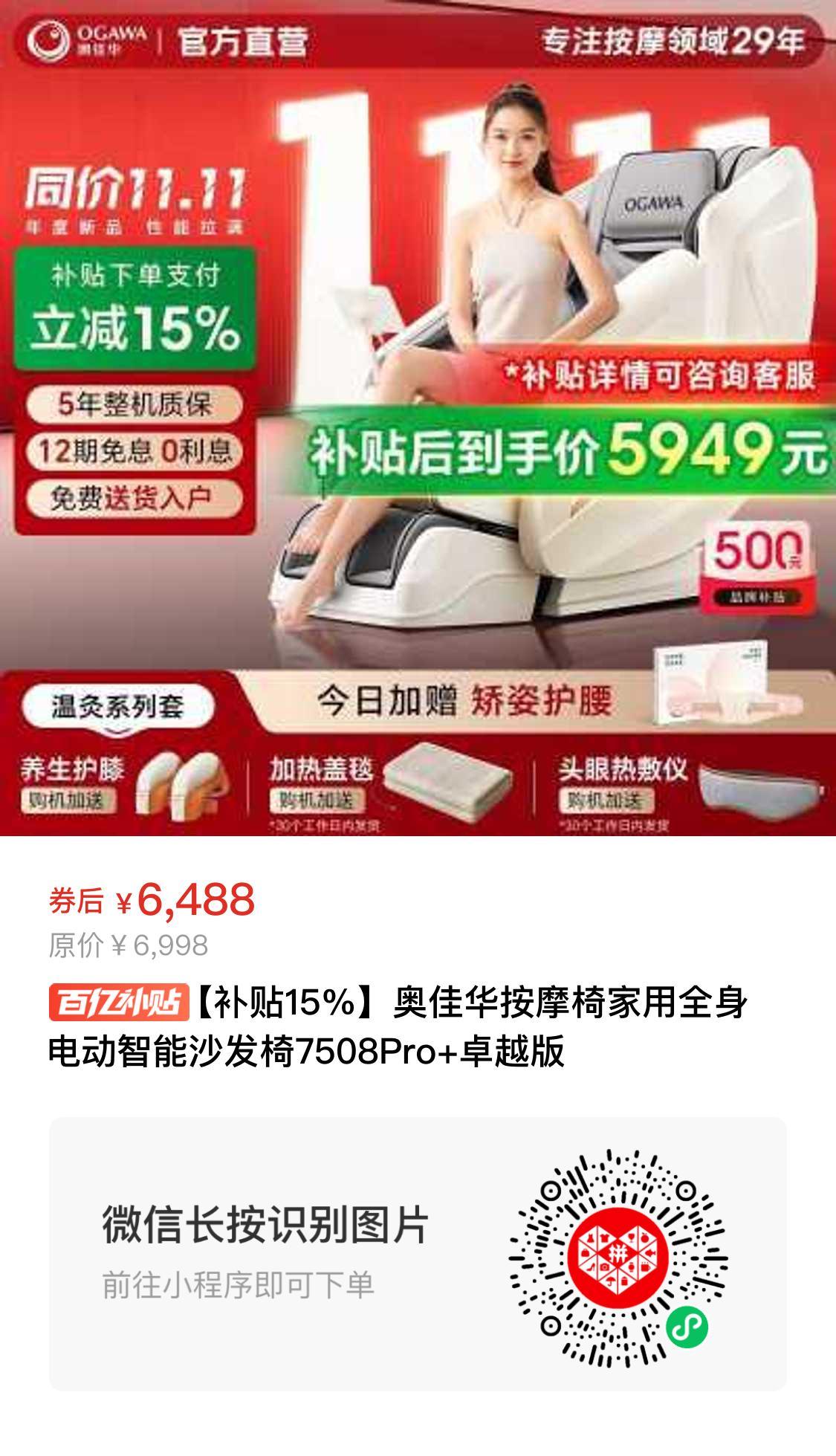 您的位置 :首页 / 优惠券 / 拼多多优惠券 【补贴15%】奥佳华按摩椅家用全身电动智能沙发椅7508Pro+卓越版 到手价:6488元 有效时间:长期有效 网购平台:拼多多 领取优惠 优惠详情 【补贴15%】奥佳华按摩椅家用全身电动智能沙发椅7508Pro+卓越版 价格:6998.00元 券后价:6488.00元 推荐理由:限量抢购!手慢无! 商品链接:购买 原图片 上一张 下一张 自动/暂停播放 相关产品 2025全身多功能揉捏智 顾家家居智能电动按 鸣仁堂按摩椅家用豪 奥克斯新款智能按摩 奥克斯2026新款按摩椅 Haier海尔新按摩椅家用 奥克斯按摩椅S500家用 豪华太空舱按摩椅家 热门标签: 奥佳华按摩椅奥佳华 上篇:【补贴15%】奥佳华按摩椅家用全身太空舱多功能电动豪华沙发X9PRO 下篇:【补贴15%】奥佳华按摩椅家用全身豪华太空舱电动智能椅OG7808pro 温馨提示:您可查看更多:拼多多优惠券 ,本文链接:https://www.haowubang.net//html/yhq/PDD/1334.html 会员充值 送月卡!夸克网盘SVIP超级会员双年卡24个月 【212元】包邮秒杀 优质素材:芒果/优酷年卡会员仅需57 福利价仅57元秒杀! 淘金币抵扣109!爱奇艺黄金vip会员10个月 【107元】包邮秒杀 爱奇艺vip会员白金12个月年卡 【183.93元】包邮秒杀 【69元1年】芒果TV会员年卡 券后【69元】包邮秒杀 送双周卡!夸克网盘SVIP超级会员12个月 【112元】包邮秒杀 推荐优惠 奥克斯SL导轨916A智能按摩椅全自动太空舱电动高端全身多功能沙发 皇家小虎安格斯牛肉饼谷饲早餐半成品美式汉堡儿童牛肉堡肉饼商用 大希地牛肉馅饼儿童早餐半成品加热即食酥皮牛肉饼早饭煎饼速冻品 沪上阿姨面包小奶砖吐司面包早餐点心便携装牛奶香手撕面包代餐 舒华马拉松跑步机家用爬坡阿波罗减震静音中高考室内健身器材E8 可心柔婴儿手口专用湿巾新生儿宝宝湿纸巾湿巾80抽带盖*12包装 打车券 滴滴打车红包天天领,新人首次打车5折起 用户可领取8折打车券,单笔交易最高抵扣10元