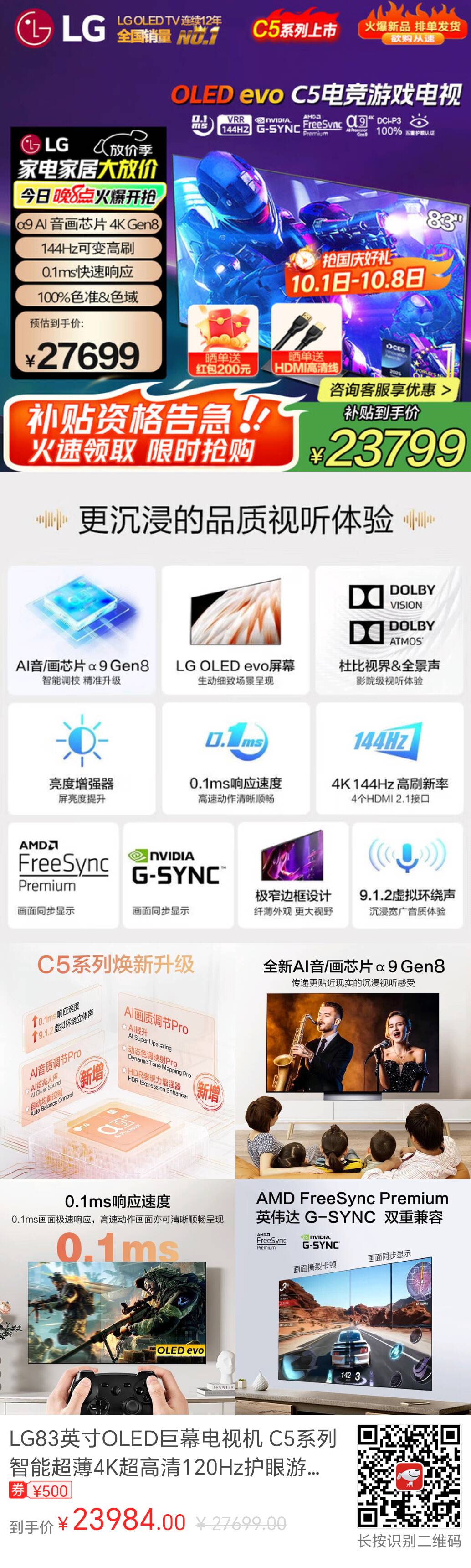 推荐理由: LG 83英寸OLED巨幕电视,C5系列智能超薄4K超高清120Hz护眼游戏电竞大屏,带来沉浸式观影体验,杜比视界让画质更出色,客厅必备的视觉盛宴!