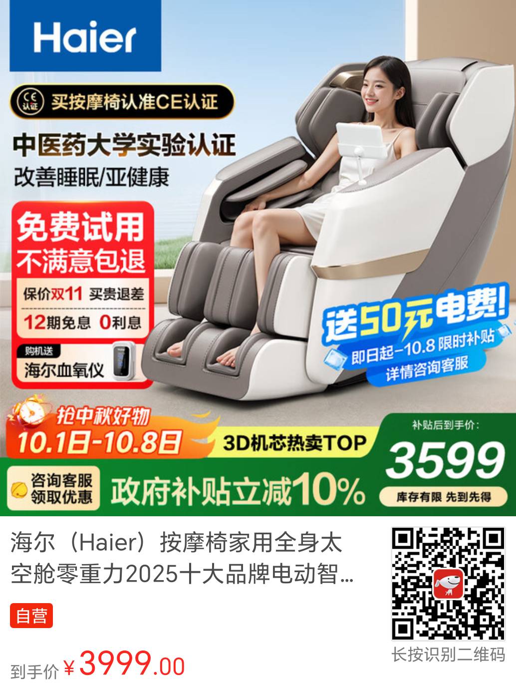 您的位置 :首页 / 优惠券 / 京东优惠券 海尔(Haier)按摩椅家用全,京东优惠信息 到手价:3999元 有效时间:长期有效 网购平台:京东 去购买 点击复制京口令 19:/海尔(Haier)按摩椅家用全身太空舱零重力2025十大品牌电动智能按摩沙发椅摇摇椅中秋节礼物实用H3-317-WU1,↦⤴️ℹ 优惠详情 【京东】海尔(Haier)按摩椅家用全身太空舱零重力2025十大品牌电动智能按摩沙发椅摇摇椅中秋节礼物实用H3-317-WU1 推荐理由:家里有了这款海尔按摩椅,仿佛拥有了私人按摩师!全身太空舱设计,零重力体验,智能按摩,舒缓一天的疲惫。京东配送,中秋送礼首选哦 到手价:¥3999.00 ——————— 抢购链接:点击购买 原图片 上一张 下一张 自动/暂停播放 相关产品 【京东】穗宝(SYMB [京东]穗宝(SYMBOL) 【京东】TCL京东联名 【京东】格力(GREE) 【京东】华凌空调 大 【京东】格力空调 【京东】华凌空调 大 LG83英寸OLED巨幕电视机 热门标签: 按摩椅海尔按摩椅京东按摩椅优惠券 上篇:京东奥克斯(AUX)按摩椅2025新款150元优惠券,到手机2230元 下篇:奥克斯新款按摩椅最新优惠券领取,到手价2959元 温馨提示:您可查看更多:京东优惠券 ,本文链接:https://www.haowubang.net//html/yhq/jingdong/49.html 淘宝优惠券 东芝冰箱【125元】优惠券,白珍珠548满配零嵌入式效制冰冰箱 石头P20UltraPlus智能全自动扫地机器人 【3654.15元】包邮秒杀 [纯平全嵌]小天鹅小乌梅3.0 10/12KG全自动滚筒洗烘一体洗衣机E40 荣泰按摩椅A52MAX款领淘宝补贴领取,政府补贴15%,到手价7399元 【政府补贴15%】荣泰S56Pro按摩椅全身按摩多功能太空舱家用沙发 【政府补贴15%】A39按摩椅全自动智能电动按摩椅家用太空舱沙发 会员充值 送月卡!夸克网盘SVIP超级会员双年卡24个月 【212元】包邮秒杀 【69元1年】芒果TV会员年卡 券后【69元】包邮秒杀 限购1件网易云音乐黑胶SVIP会员年卡 【96元】包邮秒杀 【69元1年】优酷会员vip12个月年卡 券后【69元】包邮秒杀 【69元1年】优酷会员vip12个月年卡 券后【69元】包邮秒杀 淘金币抵扣14.6!爱奇艺vip黄金会员月卡 【14.6元】包邮秒杀 本地生活 华莱士在线点餐、低至6折起 星巴克优惠券领取,在线点餐8折优惠 瑞幸咖啡在线点餐优惠券,全场饮品5.5折起 百果园水果外送,满49元包邮,全场优惠9折起 必胜客在线点餐点餐最低7折优惠券领取 库迪咖啡在线点餐送优惠券,全场6折起 连锁餐饮优惠券,最低五折起 肯德基优惠券领取,在线点餐最低5折 肯德基单单享低价,优惠点餐5折起 汉堡王优惠券领取,全场8.8折起 >