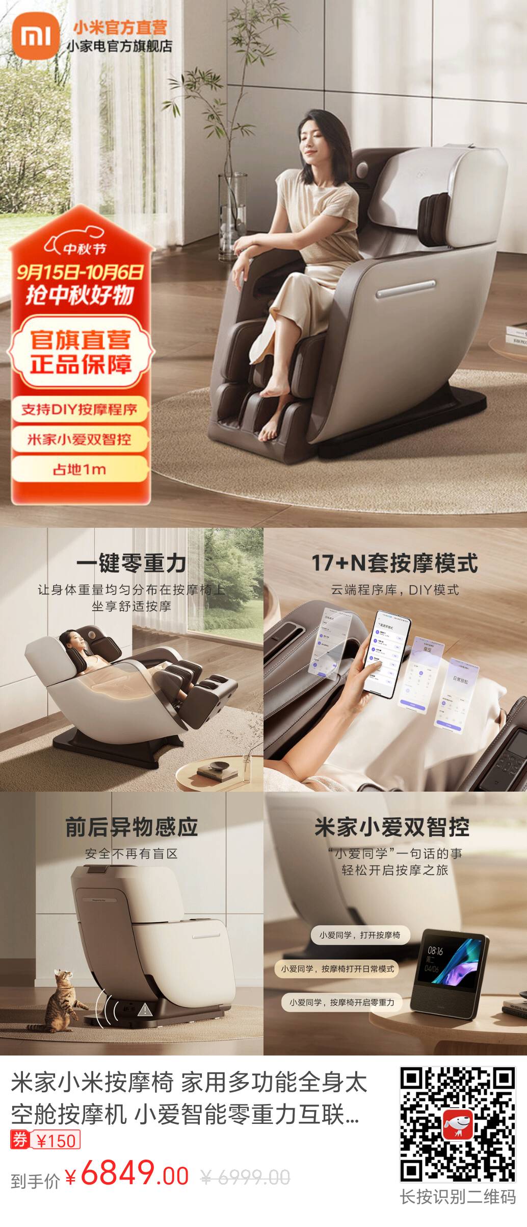 推荐理由:解锁居家放松新方式!米家小米按摩椅,智能零重力设计,多功能全身按摩,轻松享受太空舱般的舒适体验。小爱同学语音控制,操作更便捷。送礼自用两相宜,给生活加点“按摩”仪式感吧