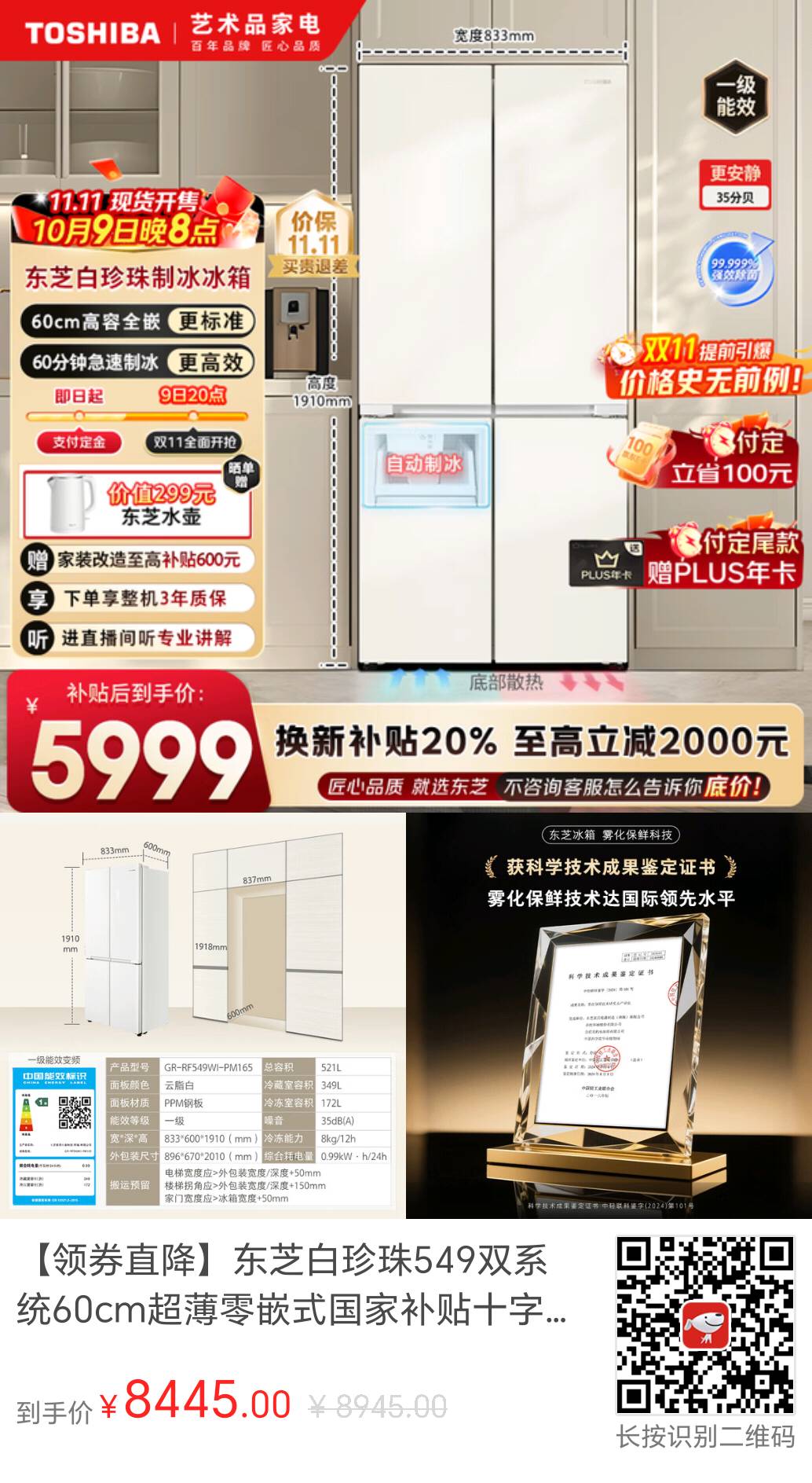 您的位置 :首页 / 优惠券 / 京东优惠券 京东东芝冰箱500元优惠券领取+最高20%补贴 到手价:8445元 有效时间:长期有效 网购平台:京东 去购买 点击复制京口令 16:/领500.0元优惠券!抢购东芝白珍珠549双系统60cm超薄零嵌式国家补贴十字双开四开门自动制冰电冰箱非大白梨GR-RF549WI-PM165,↱婛◮D○ōσng!RCNr19MEUfXyNgsg! CA1331 优惠详情 【京东】【领券直降】东芝白珍珠549双系统60cm超薄零嵌式国家补贴十字双开四开门自动制冰电冰箱非大白梨GR-RF549WI-PM165 优惠信息:8945-500(优惠券)=8445元 优惠券:500元(满5000可用) 补贴:最高补贴20% 8445元x20%(补贴)=? ——————— 京东价:¥8945.00 到手价:¥8445.00 ——————— 领券抢购:领券购买 推荐理由:这款东芝白珍珠549双系统60cm超薄零嵌式冰箱,简约大气,自动制冰功能超实用!京东配送,家电换新首选哦~ 原图片 上一张 下一张 自动/暂停播放 相关产品 【京东】穗宝(SYMB [京东]穗宝(SYMBOL) 【京东】TCL京东联名 【京东】格力(GREE) 【京东】华凌空调 大 【京东】格力空调 【京东】华凌空调 大 LG83英寸OLED巨幕电视机 热门标签: 京东优惠券东芝冰箱冰箱优惠券 上篇:小天鹅(LittleSwan)波轮洗衣机175元优惠券领取 下篇:海尔冰箱优惠券700元领取,国家以旧换新最高补贴20%, 温馨提示:您可查看更多:京东优惠券 ,本文链接:https://www.haowubang.net//html/yhq/jingdong/72.html 淘宝优惠券 东芝冰箱【125元】优惠券,白珍珠548满配零嵌入式效制冰冰箱 【政府补贴15%】A39按摩椅全自动智能电动按摩椅家用太空舱沙发 [纯平全嵌]小天鹅小乌梅3.0 10/12KG全自动滚筒洗烘一体洗衣机E40 石头P20UltraPlus智能全自动扫地机器人 【3654.15元】包邮秒杀 【政府补贴15%】荣泰S56Pro按摩椅全身按摩多功能太空舱家用沙发 荣泰按摩椅A52MAX款领淘宝补贴领取,政府补贴15%,到手价7399元 会员充值 送月卡!夸克网盘SVIP超级会员双年卡24个月 【212元】包邮秒杀 【69元1年】芒果TV会员年卡 券后【69元】包邮秒杀 淘金币抵扣14.6!爱奇艺vip黄金会员月卡 【14.6元】包邮秒杀 【69元1年】优酷会员vip12个月年卡 券后【69元】包邮秒杀 限购1件网易云音乐黑胶SVIP会员年卡 【96元】包邮秒杀 【69元1年】优酷会员vip12个月年卡 券后【69元】包邮秒杀 本地生活 必胜客在线点餐点餐最低7折优惠券领取 百果园水果外送,满49元包邮,全场优惠9折起 肯德基单单享低价,优惠点餐5折起 华莱士在线点餐、低至6折起 连锁餐饮优惠券,最低五折起 汉堡王优惠券领取,全场8.8折起 肯德基优惠券领取,在线点餐最低5折 瑞幸咖啡在线点餐优惠券,全场饮品5.5折起 库迪咖啡在线点餐送优惠券,全场6折起 星巴克优惠券领取,在线点餐8折优惠 >