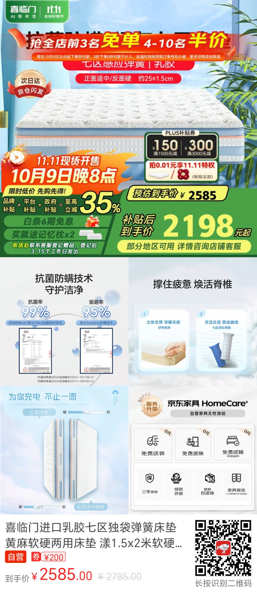 您的位置 :首页 / 优惠券 / 京东优惠券 喜临门进口乳胶弹簧床垫200元优惠券领取 到手价:2585元 有效时间:长期有效 网购平台:京东 去购买 点击复制京口令 11:/领200.0元优惠券!抢购喜临门进口乳胶七区独袋弹簧床垫 黄麻软硬两用床垫 漾1.5x2米软硬适中,→Jιιng□栋!A3pBN7Xa0nGBUXzm! MF8335 优惠详情 【京东】喜临门进口乳胶七区独袋弹簧床垫 黄麻软硬两用床垫 漾1.5x2米软硬适中 优惠信息:2785-200(优惠券)=2585元 优惠券:200元(满2000可用) ——————— 京东价:¥2785.00 到手价:¥2585.00 ——————— 领券抢购:领券购买 推荐理由:睡眠新体验,喜临门进口乳胶七区独袋弹簧床垫来啦!黄麻软硬两用,1.5x2米尺寸,软硬适中,给你一个舒适的睡眠环境。京东配送,安心入手吧! 原图片 上一张 下一张 自动/暂停播放 相关产品 【京东】穗宝(SYMB [京东]穗宝(SYMBOL) 【京东】TCL京东联名 【京东】格力(GREE) 【京东】华凌空调 大 【京东】格力空调 【京东】华凌空调 大 LG83英寸OLED巨幕电视机 热门标签: 乳胶床垫床垫优惠券喜临门床垫 上篇:慕思(de RUCCI)乳胶床垫500优惠券领取,铂尔曼总统套房款 下篇:【京东】喜临门泰国柔感乳胶双层弹簧床垫300优惠券 温馨提示:您可查看更多:京东优惠券 ,本文链接:https://www.haowubang.net//html/yhq/jingdong/98.html 淘宝优惠券 东芝冰箱【125元】优惠券,白珍珠548满配零嵌入式效制冰冰箱 荣泰按摩椅A52MAX款领淘宝补贴领取,政府补贴15%,到手价7399元 【政府补贴15%】荣泰S56Pro按摩椅全身按摩多功能太空舱家用沙发 【政府补贴15%】A39按摩椅全自动智能电动按摩椅家用太空舱沙发 [纯平全嵌]小天鹅小乌梅3.0 10/12KG全自动滚筒洗烘一体洗衣机E40 石头P20UltraPlus智能全自动扫地机器人 【3654.15元】包邮秒杀 会员充值 送月卡!夸克网盘SVIP超级会员双年卡24个月 【212元】包邮秒杀 淘金币抵扣14.6!爱奇艺vip黄金会员月卡 【14.6元】包邮秒杀 【69元1年】优酷会员vip12个月年卡 券后【69元】包邮秒杀 限购1件网易云音乐黑胶SVIP会员年卡 【96元】包邮秒杀 【69元1年】优酷会员vip12个月年卡 券后【69元】包邮秒杀 【69元1年】芒果TV会员年卡 券后【69元】包邮秒杀 本地生活 瑞幸咖啡在线点餐优惠券,全场饮品5.5折起 汉堡王优惠券领取,全场8.8折起 星巴克优惠券领取,在线点餐8折优惠 百果园水果外送,满49元包邮,全场优惠9折起 必胜客在线点餐点餐最低7折优惠券领取 库迪咖啡在线点餐送优惠券,全场6折起 连锁餐饮优惠券,最低五折起 肯德基优惠券领取,在线点餐最低5折 肯德基单单享低价,优惠点餐5折起 华莱士在线点餐、低至6折起 >