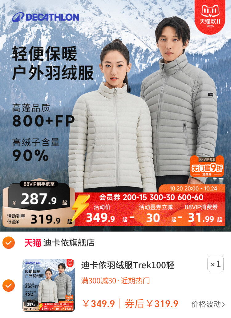 30元券迪卡侬羽绒服Trek100轻薄立领秋冬男女户外运动内胆排骨服ODT3