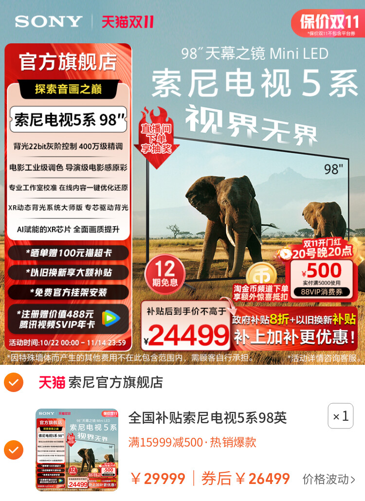 全国补贴索尼电视5系98英寸MiniLED电影级音画影院巨幕电视98XR50