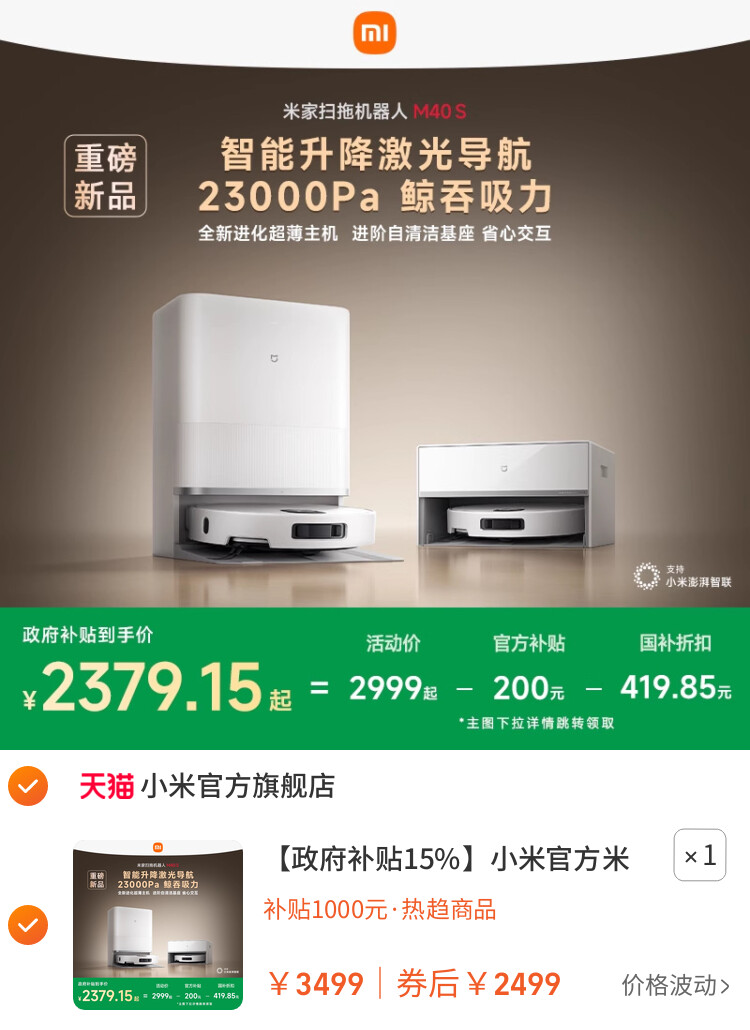 您的位置 :首页 / 优惠券 / 淘宝优惠券 【政府补贴15%】小米官方米家扫地机器人M40S/M40扫拖吸一体机 到手价:2499元 有效时间:长期有效 网购平台:淘宝 去购买 点击复制淘口令 【政府补贴15%】小米官方米家扫地机器人M40S/M40扫拖吸一体机 【推荐理由】历史热推 【到手价】2499.00元 【下单链接】38¥ CZ321 VILSfZ1cE7S¥ https://m.tb.cn/h.Sh6REdG 【政府补贴15%】小米官方米家扫地机器人M40S/M40扫拖吸一体机 优惠详情 【政府补贴15%】小米官方米家扫地机器人M40S/M40扫拖吸一体机 【推荐理由】历史热推 【到手价】2499.00元 【下单链接】https://s.click.taobao.com/Ub4a87q 原图片 上一张 下一张 自动/暂停播放 相关产品 奥克斯SL导轨916A智能 奥克斯2025新款按摩椅 OSIM傲胜V2家用全身全 【政府补贴15%】奥佳 【政府补贴15%】A39按 OSIM傲胜V3按摩椅家用 荣泰S56Pro按摩椅全身 【政府补贴15%】奥佳 热门标签: 上篇:小米米家扫地机器人H40扫地拖地自动清洗一体机扫拖吸三合一 下篇:科沃斯扫地机器人T80S自动上下水全自动智能拖吸一体洗地机器人 温馨提示:您可查看更多:淘宝优惠券 ,本文链接:https://www.haowubang.net//html/yhq/taobao/367.html 京东优惠券 【京东】穗宝(SYMBOL)3D山棕床垫宝耐尔弹簧床垫健脊防螨 亲爱嘚1.8米*2米(京仓闪发) 米家小米按摩椅150元优惠券,到手价6849元 慕思(de RUCCI)乳胶床垫床垫1.8x2米 独立筒弹簧双人卧室皇冠假日酒店款床垫 爱永恒舒适款/软硬适中-MCW1-032 京东慕思(de RUCCI)纯天然乳胶床垫,300元优惠券领取 西屋(Westinghouse)S570按摩椅150元优惠券+最高补贴115% ASKO雅士高欧洲进口洗烘套装无胶圈金属门封洗衣机+蒸汽净衣烘干衣机 会员充值 送月卡!夸克网盘SVIP超级会员双年卡24个月 【212元】包邮秒杀 送月卡!夸克网盘SVIP超级会员双年卡24个月 【212元】包邮秒杀 【69元1年】优酷会员vip12个月年卡 券后【69元】包邮秒杀 腾讯视频超级影视会员充值vip12个月,福利价仅268元秒杀! 爱奇艺vip会员白金12个月年卡 【183.93元】包邮秒杀 送双周卡!夸克网盘SVIP超级会员12个月 【112元】包邮秒杀 外卖券 饿了么红包节天天领红包活动 淘宝闪购红包,领最高15元大额红包 饿了么百元红包,开学饿请客 高校超吃卡 饿了么外卖红包,社群专享,9.9元吃饱喝足 饿了么18.8极限爆涨红包