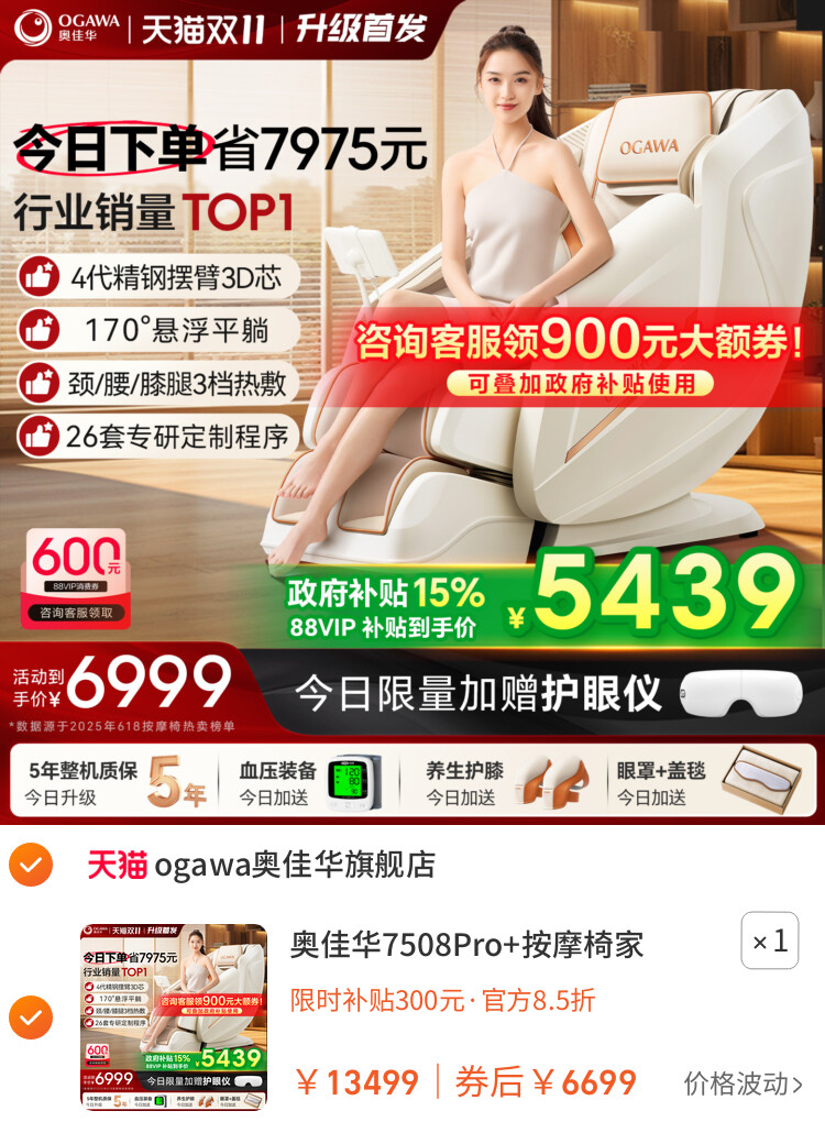 您的位置 :首页 / 优惠券 / 淘宝优惠券 奥佳华7508Pro+按摩椅家用全身小型太空舱电动智能按摩沙发椅新款 到手价:6699元 有效时间:长期有效 网购平台:淘宝 去购买 点击复制淘口令 奥佳华7508Pro+按摩椅家用全身小型太空舱电动智能按摩沙发椅新款 【推荐理由】库存紧张,同类热推 【到手价】6699.00元 【下单链接】88¥ HU108 scFRfg9TEYj¥ https://m.tb.cn/h.So2R06V 奥佳华7508Pro+按摩椅家用全身小型太空舱电动智能按摩沙发椅新款 优惠详情 奥佳华7508Pro+按摩椅家用全身小型太空舱电动智能按摩沙发椅新款 【推荐理由】库存紧张,同类热推 【到手价】6699.00元 【下单链接】https://s.click.taobao.com/3QW9qvp 原图片 上一张 下一张 自动/暂停播放 相关产品 【政府补贴15%】A39按 OSIM傲胜V3按摩椅家用 荣泰S56Pro按摩椅全身 【政府补贴15%】奥佳 荣泰A52/Pro/MAX按摩椅家 奥佳华7508Pro+按摩椅家 【政府补贴15%】奥佳 【政府补贴15%】荣泰 热门标签: 按摩椅补贴奥佳华按摩椅优惠券京东优惠券 上篇:【政府补贴15%】奥佳华按摩椅家用全身电动太空舱按摩沙发椅X9Pro 下篇:荣泰A52/Pro/MAX按摩椅家用全身豪华太空舱全自动多功能按摩沙发 温馨提示:您可查看更多:淘宝优惠券 ,本文链接:https://www.haowubang.net//html/yhq/taobao/4080.html 京东优惠券 【京东】穗宝(SYMBOL)3D山棕床垫宝耐尔弹簧床垫健脊防螨 亲爱嘚1.8米*2米(京仓闪发) 京东顾家家居按摩椅7折优惠,到手价才2543元 海尔冰箱优惠券700元领取,国家以旧换新最高补贴20%, 长虹空调优惠券领取,大1匹新一级省电 ASKO雅士高欧洲进口洗烘套装优惠券领取 【京东】喜临门泰国柔感乳胶双层弹簧床垫300优惠券 会员充值 送月卡!夸克网盘SVIP超级会员双年卡24个月 【212元】包邮秒杀 爱奇艺vip会员白金12个月年卡 【183.93元】包邮秒杀 【69元1年】优酷会员vip12个月年卡 券后【69元】包邮秒杀 腾讯视频超级影视会员充值vip12个月,福利价仅268元秒杀! 送双周卡!夸克网盘SVIP超级会员12个月 【112元】包邮秒杀 送月卡!夸克网盘SVIP超级会员双年卡24个月 【212元】包邮秒杀 外卖券 饿了么百元红包,开学饿请客 高校超吃卡 闪购新用户可领首单免单福利 饿了么外卖红包,社群专享,9.9元吃饱喝足 饿了么18.8极限爆涨红包 淘宝闪购,爆品好价外卖红包