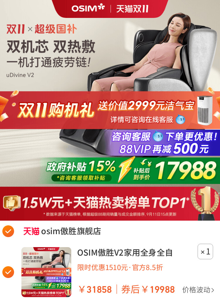 您的位置 :首页 / 优惠券 / 淘宝优惠券 OSIM傲胜V2家用全身全自动多功能智能按摩椅揉捏椅电动太空舱8212 到手价:19988元 有效时间:长期有效 网购平台:淘宝 去购买 点击复制淘口令 OSIM傲胜V2家用全身全自动多功能智能按摩椅揉捏椅电动太空舱8212 【推荐理由】近期热门,同类热推 【券面额】5581元 【到手价】19988.00元 【下单链接】58¥ CA381 tkGmfg9DQw6¥ https://m.tb.cn/h.SMNP6Wq OSIM傲胜V2家用全身全自动多功能智能按摩椅揉捏椅电动太空舱8212 优惠详情 OSIM傲胜V2家用全身全自动多功能智能按摩椅揉捏椅电动太空舱8212 【推荐理由】近期热门,同类热推 【券面额】5581元 【到手价】19988.00元 【下单链接】https://s.click.taobao.com/EsSPOjp 原图片 上一张 下一张 自动/暂停播放 相关产品 OSIM傲胜V2家用全身全 【政府补贴15%】奥佳 【政府补贴15%】A39按 OSIM傲胜V3按摩椅家用 荣泰S56Pro按摩椅全身 【政府补贴15%】奥佳 荣泰A52/Pro/MAX按摩椅家 奥佳华7508Pro+按摩椅家 热门标签: 按摩椅OSIM傲胜傲胜按摩椅 上篇:【政府补贴15%】奥佳华按摩椅全身家用太空舱按摩沙发7508Pro3.0 下篇:暂无 温馨提示:您可查看更多:淘宝优惠券 ,本文链接:https://www.haowubang.net//html/yhq/taobao/4087.html 京东优惠券 【京东】穗宝(SYMBOL)3D山棕床垫宝耐尔弹簧床垫健脊防螨 亲爱嘚1.8米*2米(京仓闪发) 京东】慕思(de RUCCI)天然乳胶垫慕斯独立筒弹簧防螨床垫 梦觉 1.8*2.0米 【京东】11.11大促主会场(无线) 荣泰(RONGTAI)按摩椅优惠券领取,350元优惠券,到手价350元 京东ASKO雅士高进口洗烘套装2000元促销券领取 喜临门进口乳胶弹簧床垫200元优惠券领取 会员充值 送月卡!夸克网盘SVIP超级会员双年卡24个月 【212元】包邮秒杀 【69元1年】优酷会员vip12个月年卡 券后【69元】包邮秒杀 【69元1年】优酷会员vip12个月年卡 券后【69元】包邮秒杀 淘宝秒杀:【学生专享卡45】腾讯视频VIP会员三个月 福利价仅45元秒杀 【69元1年】优酷会员vip12个月年卡 券后【69元】包邮秒杀 爱奇艺vip会员白金12个月年卡 【183.93元】包邮秒杀 外卖券 饿了么红包节天天领红包活动 淘宝闪购,爆品好价外卖红包 饿了么18.8极限爆涨红包 淘宝闪购红包,领最高15元大额红包 饿了么霸王餐红包,评价有礼单单返