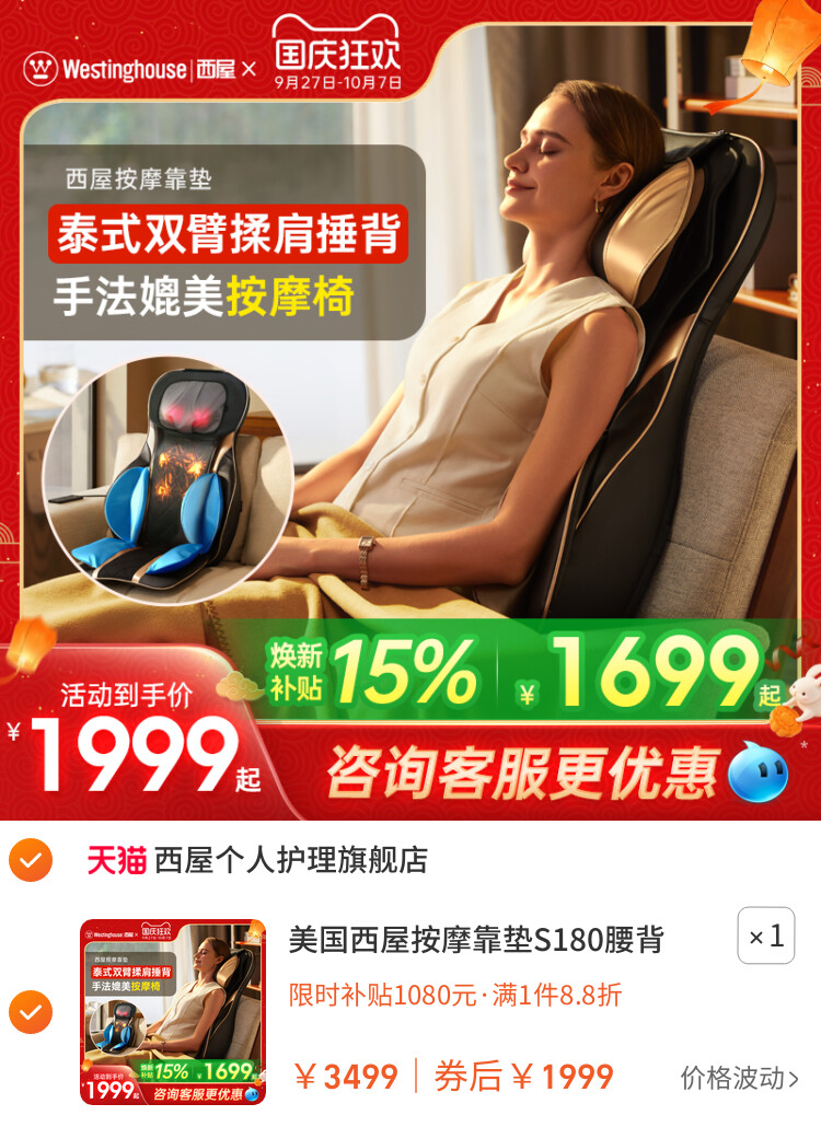 您的位置 :首页 / 优惠券 / 淘宝优惠券 美国西屋按摩靠垫S180腰背部全身按摩器全自动按摩仪分体按摩椅 到手价:1999元 有效时间:长期有效 网购平台:淘宝 去购买 点击复制淘口令 29¥ HU293 GUGM4zUSvFI¥ https://m.tb.cn/h.S5EKgmW 美国西屋按摩靠垫S180腰背部全身按摩器全自动按摩仪分体按摩椅 优惠详情 美国西屋按摩靠垫S180腰背部全身按摩器全自动按摩仪分体按摩椅 【推荐理由】历史热推,库存紧张 【到手价】1999.00元 【下单链接】点击下单 原图片 上一张 下一张 自动/暂停播放 相关产品 奥克斯SL导轨916A智能 奥克斯2025新款按摩椅 OSIM傲胜V2家用全身全 【政府补贴15%】奥佳 【政府补贴15%】A39按 OSIM傲胜V3按摩椅家用 荣泰S56Pro按摩椅全身 【政府补贴15%】奥佳 热门标签: 按摩椅西屋按摩椅 上篇:荣泰按摩椅A52MAX款领淘宝补贴领取,政府补贴15%,到手价7399元 下篇:奥克斯新款高端按摩椅太空舱淘宝优惠,补贴到手价7980元 温馨提示:您可查看更多:淘宝优惠券 ,本文链接:https://www.haowubang.net//html/yhq/taobao/43.html 京东优惠券 【京东】穗宝(SYMBOL)3D山棕床垫宝耐尔弹簧床垫健脊防螨 亲爱嘚1.8米*2米(京仓闪发) 米家小米按摩椅150元优惠券,到手价6849元 慕思(de RUCCI)乳胶床垫床垫1.8x2米 独立筒弹簧双人卧室皇冠假日酒店款床垫 爱永恒舒适款/软硬适中-MCW1-032 ASKO雅士高欧洲进口洗烘套装无胶圈金属门封洗衣机+蒸汽净衣烘干衣机 西屋(Westinghouse)S570按摩椅150元优惠券+最高补贴115% 京东慕思(de RUCCI)纯天然乳胶床垫,300元优惠券领取 会员充值 送月卡!夸克网盘SVIP超级会员双年卡24个月 【212元】包邮秒杀 送双周卡!夸克网盘SVIP超级会员12个月 【112元】包邮秒杀 腾讯视频超级影视会员充值vip12个月,福利价仅268元秒杀! 送月卡!夸克网盘SVIP超级会员双年卡24个月 【212元】包邮秒杀 爱奇艺vip会员白金12个月年卡 【183.93元】包邮秒杀 【69元1年】优酷会员vip12个月年卡 券后【69元】包邮秒杀 外卖券 饿了么百元红包,开学饿请客 高校超吃卡 淘宝闪购红包,领最高15元大额红包 饿了么红包节天天领红包活动 饿了么外卖红包,社群专享,9.9元吃饱喝足 饿了么18.8极限爆涨红包