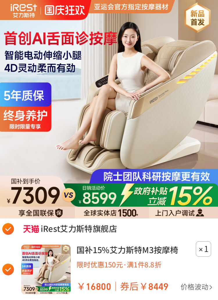您的位置 :首页 / 优惠券 / 淘宝优惠券 艾力斯特M3按摩椅家领取补贴,券面额6185元,到手价8449元 到手价:8449元 有效时间:长期有效 网购平台:淘宝 去购买 点击复制淘口令 87¥ HU926 CjOH4zUlHGP¥ https://m.tb.cn/h.S5EEeSd 国补15%艾力斯特M3按摩椅家用全身智能全自动电动太空舱沙发新款 优惠详情 淘宝按摩椅优惠券,艾力斯特M3按摩椅家领取补贴,券面额6185元,到手价8449元 国补15%艾力斯特M3按摩椅家用全身智能全自动电动太空舱沙发新款 【推荐理由】历史热推 【券面额】6185元 【到手价】8449.00元 【下单链接】点击下单 原图片 上一张 下一张 自动/暂停播放 相关产品 奥克斯SL导轨916A智能 奥克斯2025新款按摩椅 OSIM傲胜V2家用全身全 【政府补贴15%】奥佳 【政府补贴15%】A39按 OSIM傲胜V3按摩椅家用 荣泰S56Pro按摩椅全身 【政府补贴15%】奥佳 热门标签: 按摩椅优惠券按摩椅补贴艾力斯特优惠券 上篇:奥克斯新款高端按摩椅太空舱淘宝优惠,补贴到手价7980元 下篇:2025AUX/奥克斯按摩椅4D-UItra家用全身多功能大型SL导轨太空舱椅 温馨提示:您可查看更多:淘宝优惠券 ,本文链接:https://www.haowubang.net//html/yhq/taobao/45.html 京东优惠券 【京东】穗宝(SYMBOL)3D山棕床垫宝耐尔弹簧床垫健脊防螨 亲爱嘚1.8米*2米(京仓闪发) 西屋(Westinghouse)S570按摩椅150元优惠券+最高补贴115% 米家小米按摩椅150元优惠券,到手价6849元 慕思(de RUCCI)乳胶床垫床垫1.8x2米 独立筒弹簧双人卧室皇冠假日酒店款床垫 爱永恒舒适款/软硬适中-MCW1-032 京东慕思(de RUCCI)纯天然乳胶床垫,300元优惠券领取 ASKO雅士高欧洲进口洗烘套装无胶圈金属门封洗衣机+蒸汽净衣烘干衣机 会员充值 送月卡!夸克网盘SVIP超级会员双年卡24个月 【212元】包邮秒杀 爱奇艺vip会员白金12个月年卡 【183.93元】包邮秒杀 送月卡!夸克网盘SVIP超级会员双年卡24个月 【212元】包邮秒杀 腾讯视频超级影视会员充值vip12个月,福利价仅268元秒杀! 送双周卡!夸克网盘SVIP超级会员12个月 【112元】包邮秒杀 【69元1年】优酷会员vip12个月年卡 券后【69元】包邮秒杀 外卖券 饿了么18.8极限爆涨红包 饿了么外卖红包,社群专享,9.9元吃饱喝足 淘宝闪购红包,领最高15元大额红包 饿了么百元红包,开学饿请客 高校超吃卡 饿了么红包节天天领红包活动