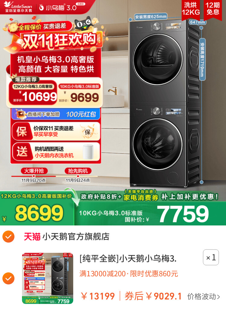 [纯平全嵌]小天鹅小乌梅3.0洗烘套装12/10KG洗衣机变频热泵烘干机