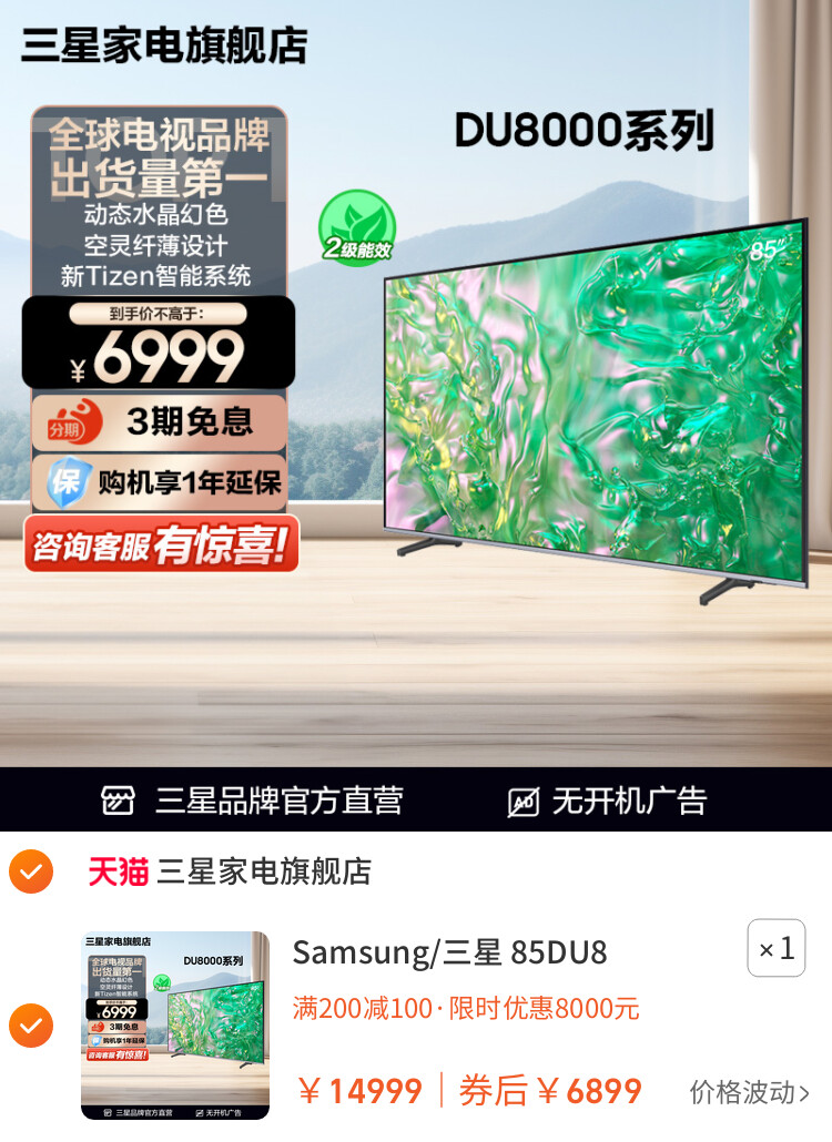 Samsung/三星 85DU8000 85英寸LED 4K大屏智能液晶电视机