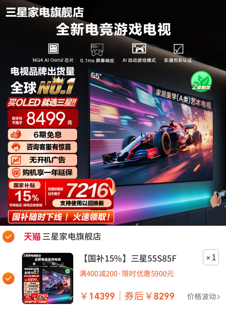 【国补15%】三星55S85F 55英寸新一代AI OLED 4K电视机 护眼认证