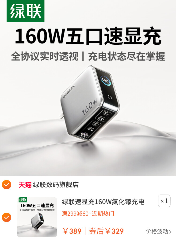 绿联速显充160W氮化镓充电器头PD3.1快充头适用苹果iPhone17小米华为MacBook笔记本电脑手机平板140W多口插头